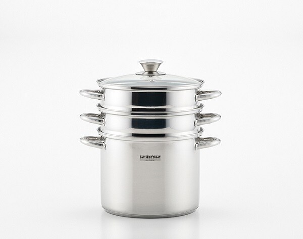 パスタや野菜が茹でやすい!ストレーナー付で湯切がラクラク!深型鍋&飲茶や温野菜を作るのにも重宝するスチーマーが付属!重ねて収納出来るのでキッチンスペースをスッキリ収納!!
