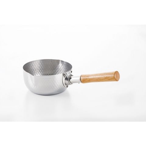 雪深い越後人が生み出した技で作り上げた鍋、天然木で安定感あるハンドル持ち手、直火からIH調理器にもOK。外観には、手作りあふれるような鎚目仕上げ。天然木で使い込むほど手になじむハイグリップ感覚。木柄カツラ部分も熱源に考慮し長く、木柄止めネジも長く2本止め。