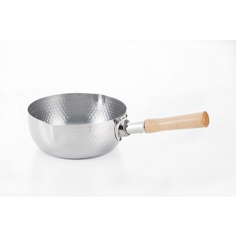 雪深い越後人が生み出した技で作り上げた鍋、天然木で安定感あるハンドル持ち手、直火からIH調理器にもOK。外観には、手作りあふれるような鎚目仕上げ。天然木で使い込むほど手になじむハイグリップ感覚。木柄カツラ部分も熱源に考慮し長く、木柄止めネジも長く2本止め。