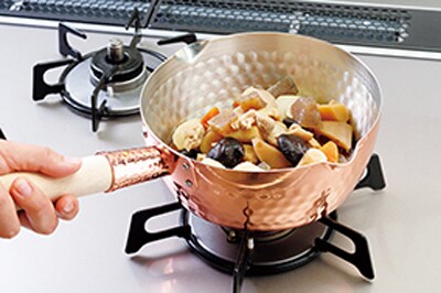 熱伝導が良い銅製の雪平鍋。弱火で調理することで素材の味を生かせます。均一に熱が伝わるので、短時間で料理がムラなく仕上がります。