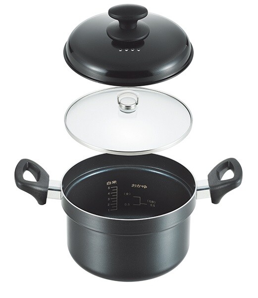 ごはんがおいしく炊ける炊飯鍋。鍋内側は容量の目安が確認しやすい目盛付。内面フッ素加工でお手入れしやすい。内蓋はガラス製のため炊飯時に沸騰や水分量を確認する際、蒸気を逃すことなくおいしくご飯を炊くことが出来ます。