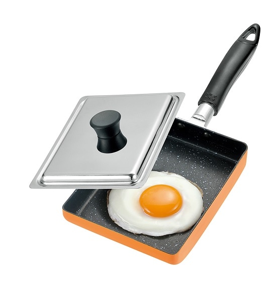 耐久性の高いマーブルコーティングでこげつきにくく、キレイに焼ける!!フタ付だから目玉焼きの白身がふっくら仕上がる!!