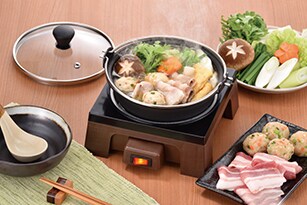 鍋は着脱式で丸洗いOK。鍋内面は離型性の良いフッ素樹脂塗装。スイッチ一つの簡単操作。「すき焼き」「湯豆腐」が作れるかんたんレシピ付き。