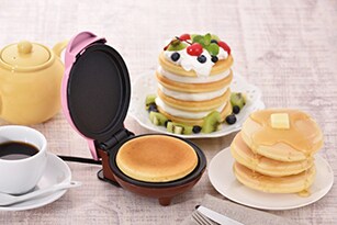 手のひらサイズのパンケーキメーカー。直径10cmのプチパンケーキが約3分で作れます。上下の熱源でひっくり返さず時短調理。かんたんレシピ付。