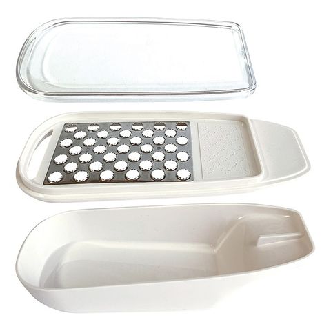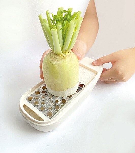 切れ味の良いステンレス刃でなめらかなすり心地。水分を逃さずおろすことができシャキシャキ触感を楽しめます。すべり止め付きで楽々おろせます。まとめて収納できます。薬味おろし付き。