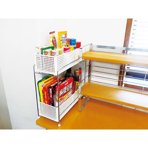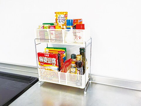 バスケットの仕切りは収納に合わせて分別がしやすく便利。上下ともバスケットがスライドするので出窓・シンク下・洗面台下でも便利に使えます。