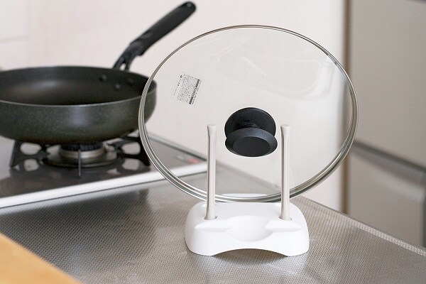 置き場所に困るなべ蓋を立てられる。多機能で衛生的なふたスタンド。