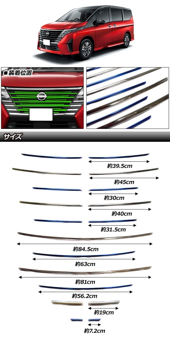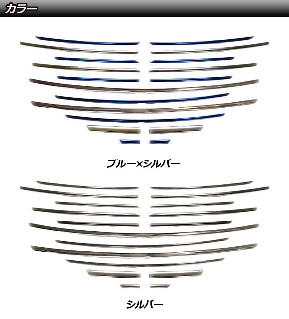 フロントグリルガーニッシュ 日産 セレナ C28系 ハイウェイスター専用 2022年12月~ ブルー×シルバー ステンレス製 入数:1セット(18個) AP-FG631-BLSI