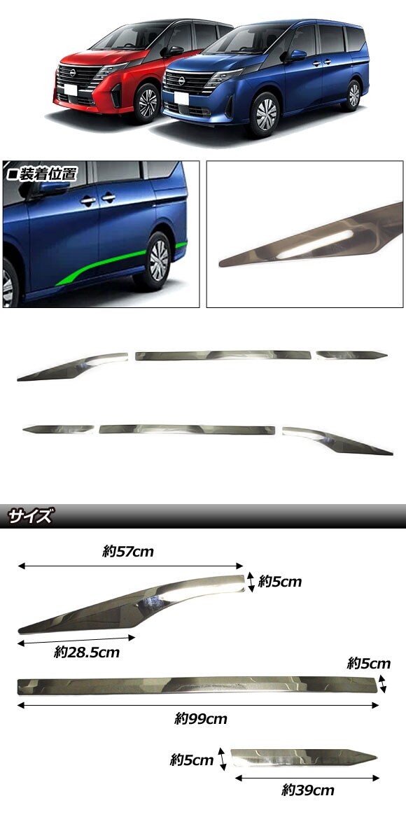 サイドドアガーニッシュ 日産 セレナ C28系 e-POWER可 2022年12月~ シルバー ステンレス製 入数:1セット(6個) AP-DG323