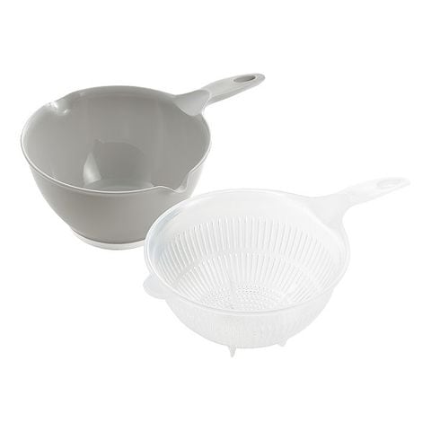 両側に注ぎ口がついた片手ボウルと目が細かいザルのセット※抗菌加工