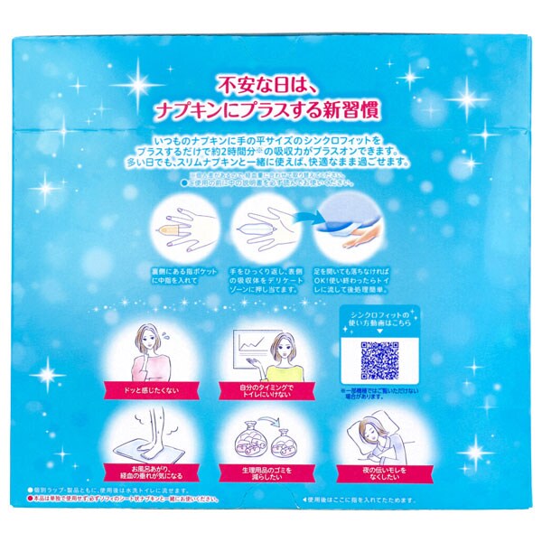 ●いつものナプキンに手の平サイズのシンクロフィットをプラスするだけで約2時間分の吸収力がプラスオンできます。
