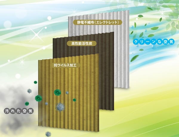 通気性と脱臭力・集塵効率を最適化したトータルバランスに優れた濾材設計。