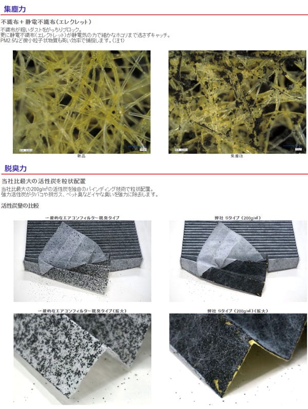 強力活性炭がタバコや排ガス、ペット臭などイヤな臭いを強力に除去します。