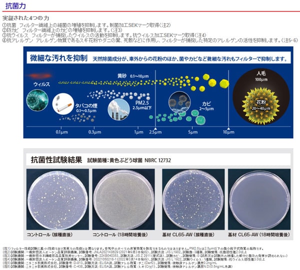 (3)抗ウィルス:フィルターが捕捉したウイルスの活動を抑制します。抗ウイルス加工SEKマーク取得