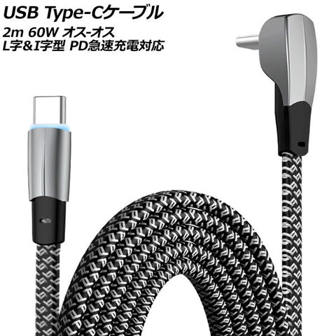 USB Type-Cケーブル ブラック×シルバー 2m 60W オス-オス L字&I字型 PD急速充電対応 AP-UJ1034-2M