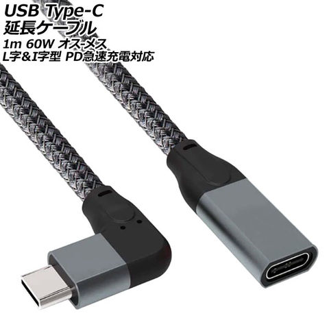USB Type-C延長ケーブル グレー 1m 60W オス-メス L字&I字型 PD急速充電対応 AP-UJ1035-1M