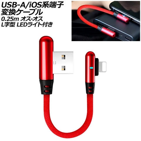 USB-A/iOS系端子 変換ケーブル レッド 0.25m オス-オス L字型 LEDライト付き AP-UJ1037-RD
