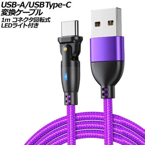 USB-A/USB Type-C 変換ケーブル パープル 1m コネクタ回転式 オス-オス LEDライト付き AP-UJ1023-PU-1M