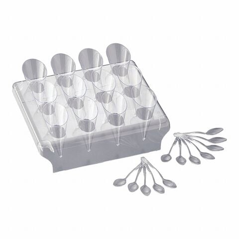 セット内容:ディスプレイスタンド(240×215×H60)×1個、プチコーン30cc(43×58×H100)×12個、ミニスプーン(全長95)×12本