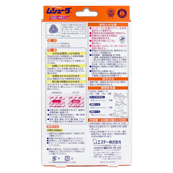 エステー ムシューダ 引き出し・衣装ケース用 1年間有効 大切な衣類をしっかり防虫! 入数:1箱(24個入)