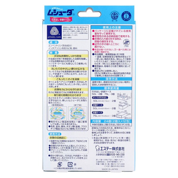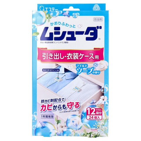 エステー ムシューダ 引き出し・衣装ケース用 マイルドソープの香り 1年間有効 大切な衣類をしっかり防虫! 入数:1箱(24個入)