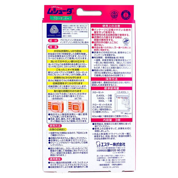 エステー ムシューダ クローゼット用 やわらかフローラルの香り 1年間有効 大切な衣類をしっかり防虫! 入数:1箱(3個入)