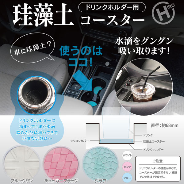HIRO 珪藻土コースター ドリンクホルダー用 ブルックリン 直径6.8cm シリコンカバー付き 愛車のドリンクホルダー底面に置くだけ 選べる3カラー 入数:1個