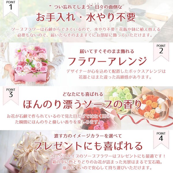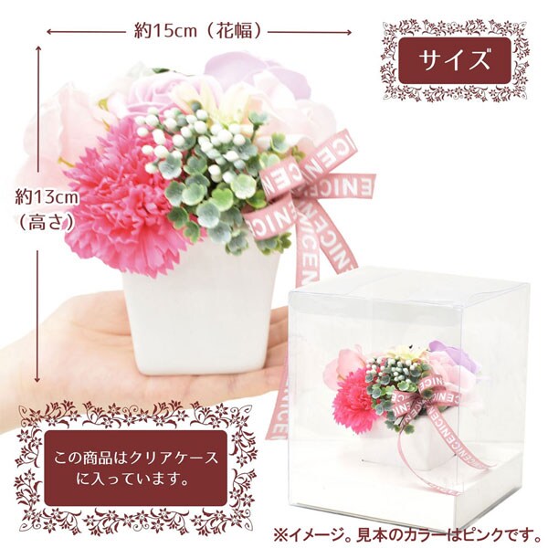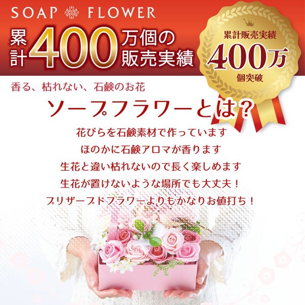 ほのかな香りとボリューム感たっぷりで華やか、石けんで出来ているため枯れることなくお手入れ不要です。