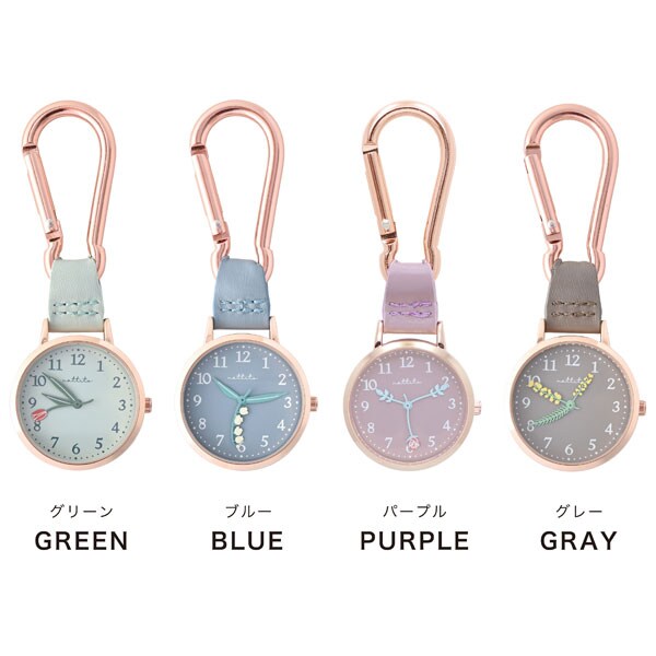 フラワーモチーフの針が時間を教えてくれるカラビナウォッチ。