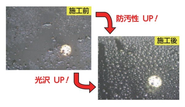 有機樹脂及び揮発性有機化合物(VOC)を使用せず、オルガノポリシロキサンを主剤とした無溶剤・無機質塗料から開発しました。空気中の湿気と温度によって常温で硬化が促進され、従来の有機結合よりも強い無機結合により、緻密で強靭な不活性の被膜を形成します。耐熱性で紫外線、光エネルギー波長での材質変化は起こりにくく、耐酸性がある超耐久性のガラス質のコーティングを実現しました。まさに「ファーストクラスのコーティング」です。