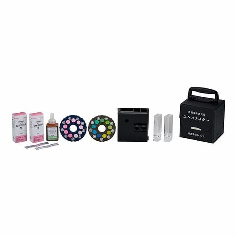 セット内容:ケース×1、測定器本体×1、比色用セル×2、残留塩素濃度用比色回転板×1、pH用比色回転板×1、塩素用DPD試薬S(50包装)×2箱、pH用BTB指示薬(35ml)×1