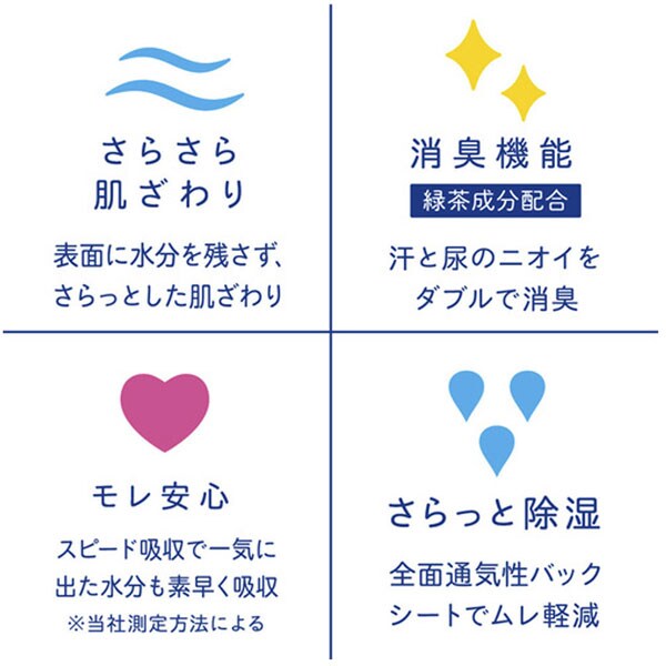 スピード吸収で一気に出た水分も素早く吸収。モレ安心。(大王製紙株式会社測定方法による)