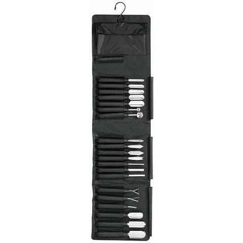 セット内容:丸刃 最小7mm、丸刃 小10mm、丸刃 中13mm、丸刃 大16mm、丸刃 特大19mm、V刃 小8mm、V刃 中11mm、V刃 大14mm、M刃 6(11)mm、U刃 小3mm、U刃 大7mm、細波刃 小19mm、細波刃 大24mm、波刃 小19mm、丸ボーラー φ12mm、丸ボーラー φ20mm、シャープナー 6mm、ループ長三角形 15mm、ループ正三角形 21mm、ループティアドロップ 6mm