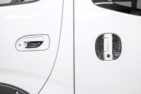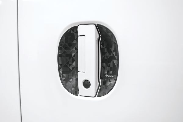 ドア開閉時にうっかり付いてしまうドアハンドル部のひっかきキズや汚れを防止します。車種のドアハンドル形状(くぼみ)に合わせてカットされた専用設計で、表面の艶を控えめにしたジオメトリック柄がドアハンドル部をさり気なくドレスアップします。強力な粘着面で接着するため、簡単に剥がれることなくしっかり貼付けることができます。
