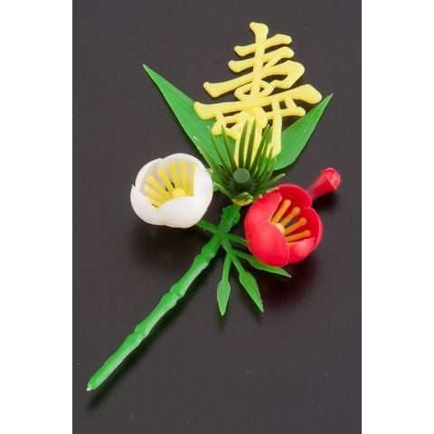 おせち料理やオードブル、ハレの日(特別な日)などの慶事料理に彩りを加えるプラスチック製の造花(料理飾り)です。梅には子孫繁栄や夫婦円満を願う意味があり、縁起の良いものとされています。紅梅のあでやかさと白梅の上品さが、祝い事を華やかに演出します。さらに黄色の「寿」の文字が喜びを表しています。