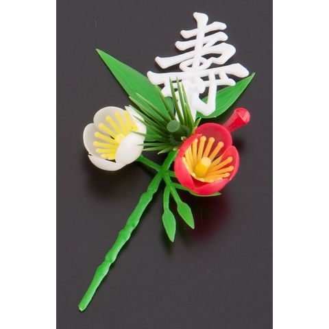 おせち料理やオードブル、ハレの日(特別な日)などの慶事料理に彩りを加えるプラスチック製の造花(料理飾り)です。梅には子孫繁栄や夫婦円満を願う意味があり、縁起の良いものとされています。紅梅のあでやかさと白梅の上品さが、祝い事を華やかに演出します。さらに白色の「寿」の文字が喜びを表しています。