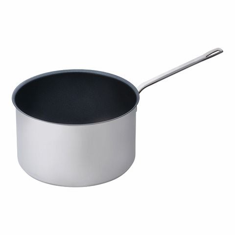 業務用電磁調理器に最適な極厚底単層構造に内面ストロングコート加工でお手入れが簡単。こびり付き易い食材もラクラク洗浄できます。
