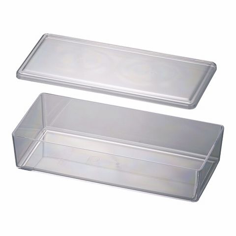 ポリカーボネイト製の蓋付バットは、衝撃に強く、内容物が外から一目で見分けられます。