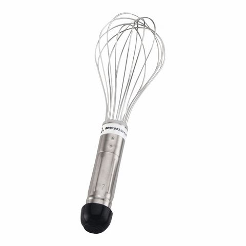 独自の特殊樹脂を注入のため、柄の中に水がはいりにくく衛生的です。円盤状のヘッド部は、ひっかかりがあるためホイップしても、手がすべる心配がありません。特殊加工技術により、柄と線材が固定され、さらに抜けにくい構造になっています。