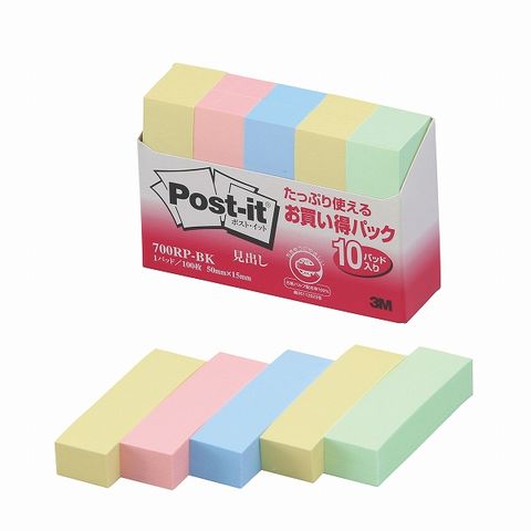 スリーエム(3M) ポストイット 見出し 再生紙 多色アソート 50×15mm お買い得パック 入数:1パック(10パッド) 700RP-BK(16889)