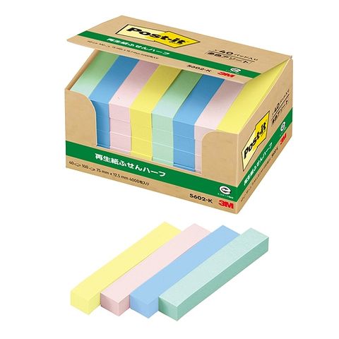 スリーエム(3M) ポストイット ふせんハーフ 再生紙 多色アソート 75×12.5mm 入数:1パック(40パッド) 5602-K(26391)