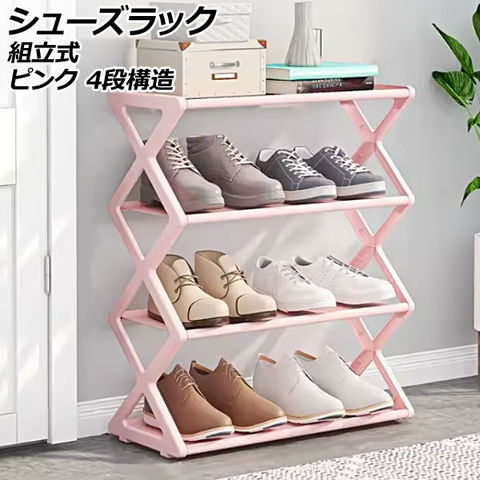 シューズラック ピンク 4段構造 デザイン1 組立式 靴で散らかった玄関スペースをすっきり整頓 AP-UJ1114-PI