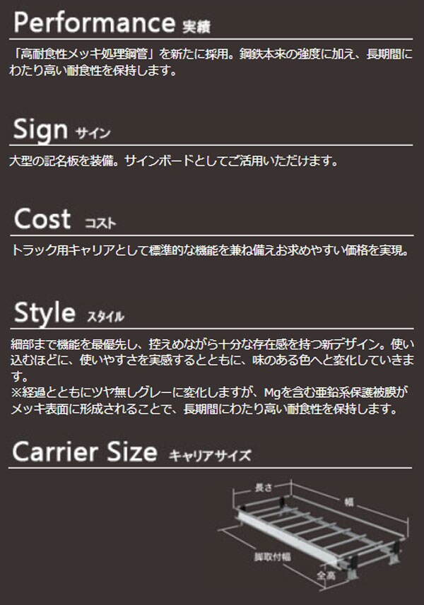 コストパフォーマンスに優れた、信頼と実績のトラック用キャリアです。