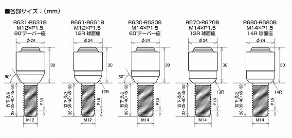 ●60°テーパー座・各種球面座、ネジ径M12・M14、首下28・35・40・45・50mmの5サイズ。