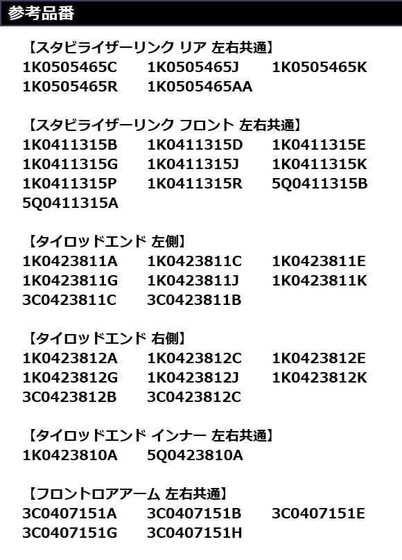 1K0-505-465C | 1K0-505-465J | 1K0-505-465K | 1K0-411-315B | 1K0-411-315D | 1K0-411-315E5Q0-411-315B | 5Q0-411-315A | 1K0-423-811A | 1K0-423-811C | 3C0-423-811C | 3C0-423-811B | 1K0-423-812A | 1K0-423-812C | 3C0-423-812B | 3C0-423-812C | 1K0-423-810A | 5Q0-423-810A | 3C0-407-151A | 3C0-407-151B | 3C0-407-151E