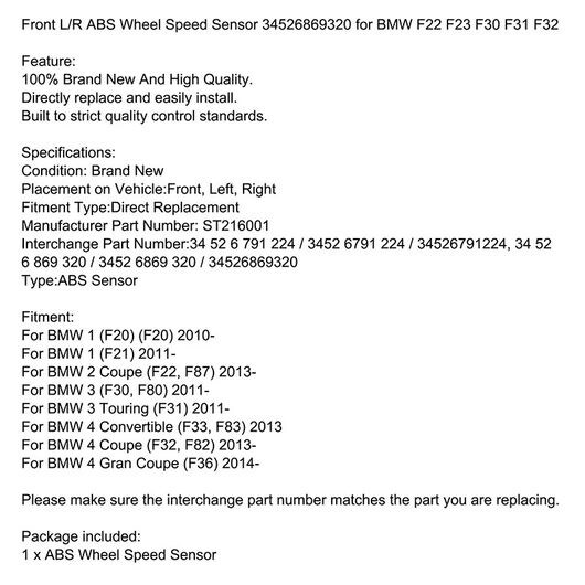 ABS ホイールスピードセンサー フロント 右 左 適用: BMW F20 F87 F30 F31 F36 F33 F32 F80 F83 F82 118i 125I M2 328i 420I 428i 34526869320 SR-CC-2011