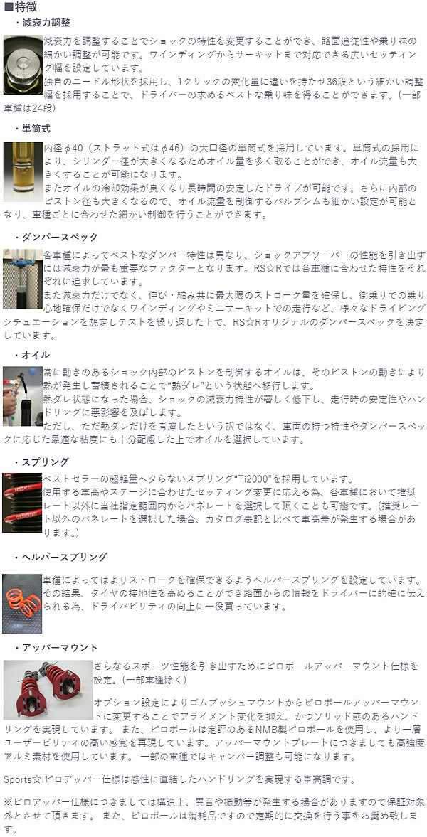 RS★R 株式会社ティエムシー アールエス・アール アールエスアール あーるえすあーる RSR RS☆R 車高調 車高調整式 ショックアブソーバー サスペンションパーツ サスペンションセット スプリング ショックアブソーバ キット セット KIT SHOCK ABSORBER ローダウン ダウンサス ドレスアップ パーツ 単筒式 モノチューブ ミドルタイプ 減衰力調整 Sports-i スポーツアイ ピロアッパー仕様 Pillow Upper Mount type