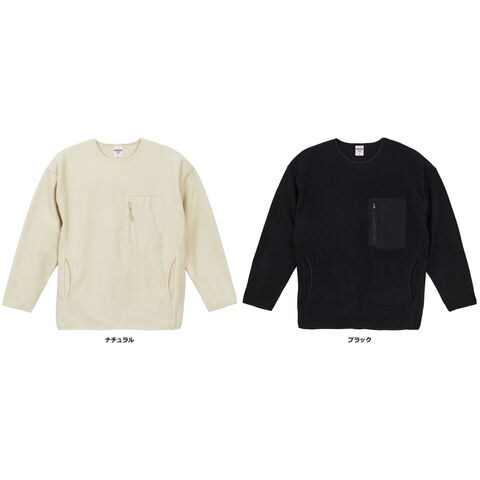 男女問わず肌寒い季節に大活躍 あらゆるシーンに寄りそうクルーネックタイプのフリース.やわらかな肌ざわりで保温性に優れており、カジュアルな装いからアウトドアアクティビティまで幅広いシーンで活躍するフリースシャツ.ベーシックなクルーネックタイプで首もとの仕様がすっきりとしており、インナーとしても使い勝手抜群.サイドポケットのパイピング仕様は手の出し入れのしやすさにもアプローチしています.サイズ感もざっくりとしており、今っぽい着こなしが可能.ナイロン素材のポケットへのプリント加工やフリース生地への刺繍加工など、オリジナルアイテム作りに欠かせないアイテムです!