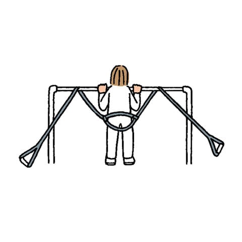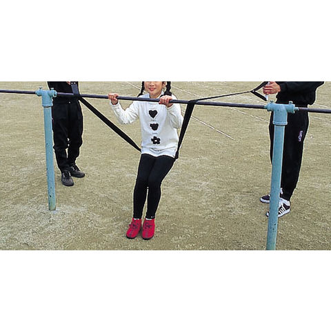 鉄棒にテープをかけ、お尻にセットします.→両サイドのハンドルを引っぱります.→逆上がりのタイミングをマスターできます.逆上がりがこんなに簡単!