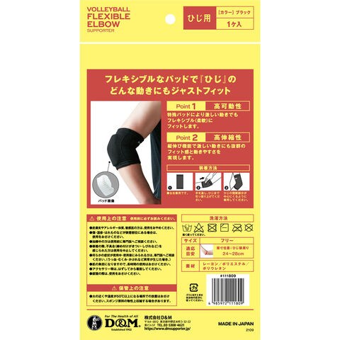 バレーボール用のパッド付きヒジ用サポーター.特殊パッドで激しい動きでもフレキシブルにフィット.縦伸び機能で激しい動きにもフィット感と動きやすさを実現.